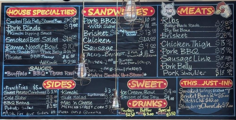 The menu offers a diverse array of dishes. Starters like Pork Rinds and Smoked Beet Salad kick off the meal. For mains, smoked meats like Chicken Thigh and brisket define the barbeque experience. Sandwiches are also available, featuring Pork BBQ and Chicken, perfect for those on-the-go. Satisfy sweet cravings with the Dessert of the Day, which varies but delights each visit. Also, look out for unique specials like Meaty Mac 'N Cheese and Kimchi Fried Rice. Dig into sides like Sweet Potato Cornbread and BBQ Beans to round out the meal. Prices are reasonable, ensuring great value for every diner.
