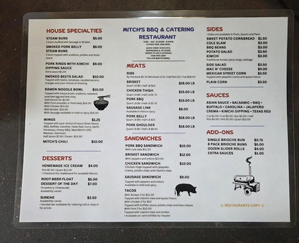 Welcome to Mitch's Barbeque Restaurant & Catering, where we serve up real barbeque and homemade ice cream in a relaxed and inviting atmosphere. Located in Warrendale, PA, we pride ourselves on delivering delicious local specialties for lunch and dinner, perfect for solo diners, families, and groups alike. Enjoy our outdoor terrace, or opt for delivery and takeout options. Our extensive menu features an array of meats, simple traditional dishes, refreshing drinks, and delightful desserts. With accessibility features and a commitment to quick service, your unforgettable barbeque experience awaits. Reserve your table today and indulge in the flavors of Mitch's!